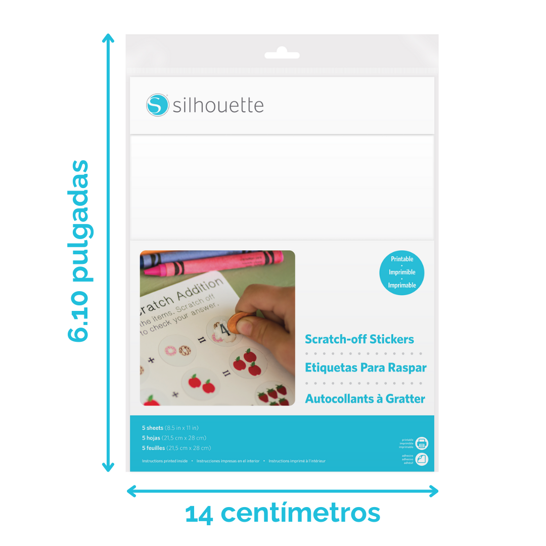 Las hojas adhesivas raspables tienen una película adhesiva con una capa opaca. Simplemente imprima el texto que desea ocultar temporalmente en una hoja de papel normal (u otro material) y luego adhiera una forma recortada de la hoja adhesiva para raspar sobre el área impresa. El texto impreso permanecerá cubierto hasta que raspe el área opaca para revelar el mensaje. Diversión para crear juegos, materiales promocionales o anuncios sorpresa que se pueden ocultar hasta que esté listo para que se revelen.