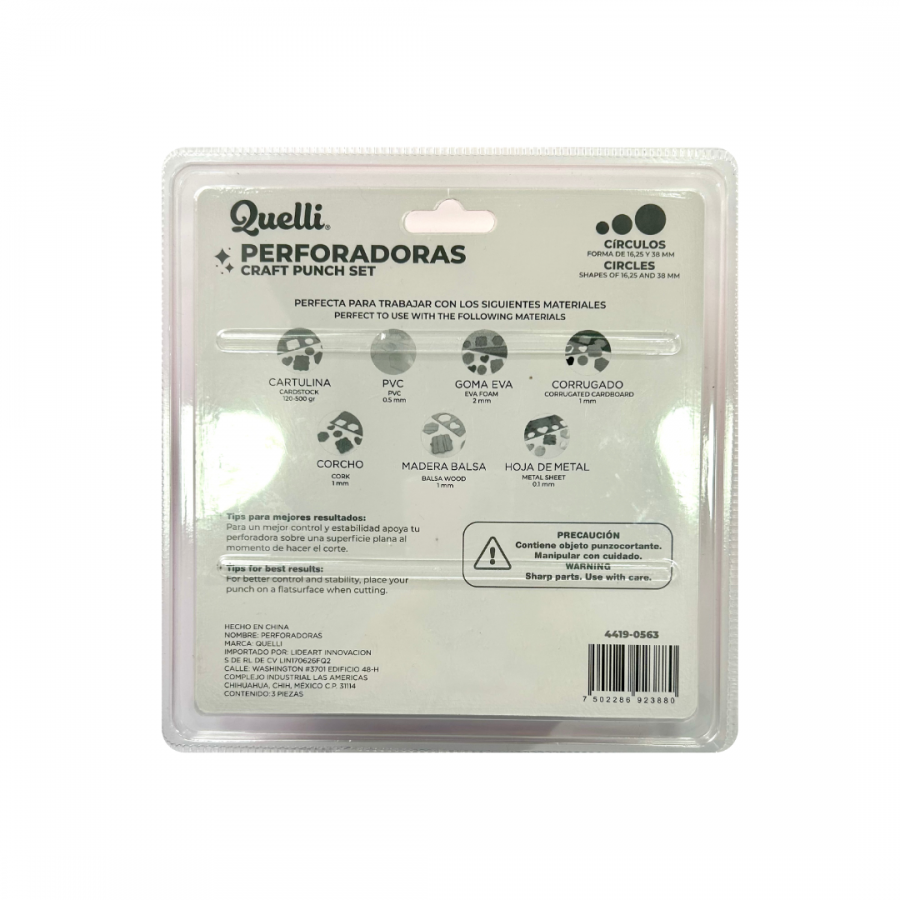 · Set con 3 perforadoras de tamaños distintos: 16 mm, 25 mm y 38 mm.